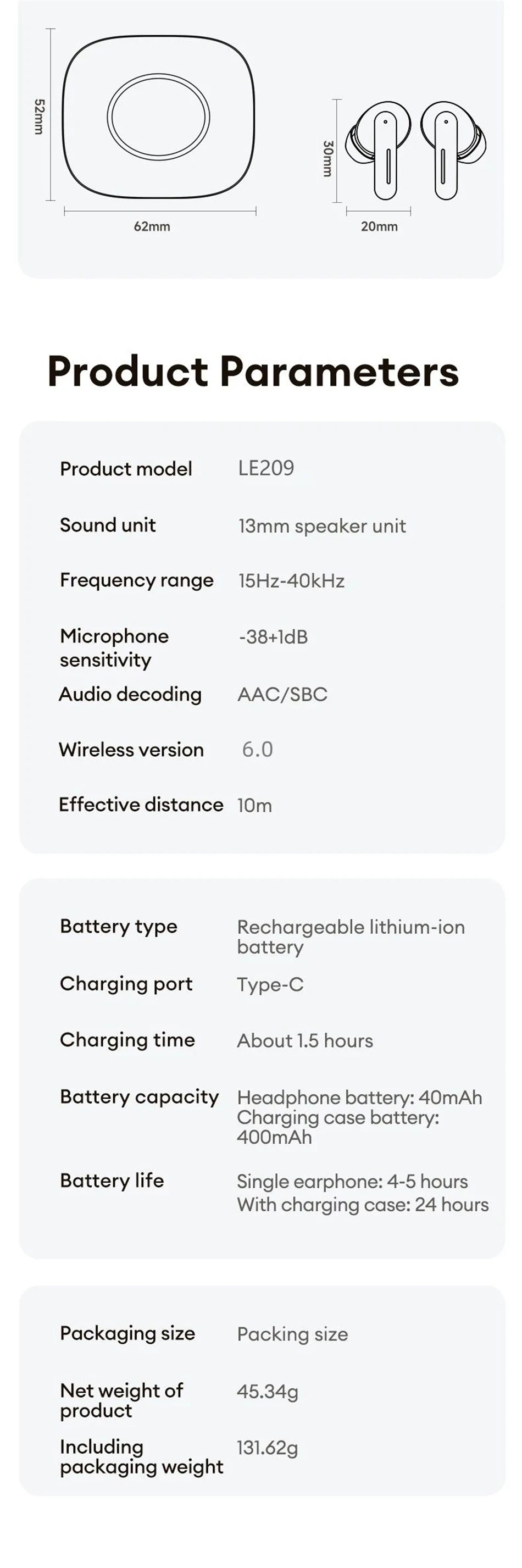 11.Battery capacity:Headphone battery: 40mAh Charging case battery:400mAh