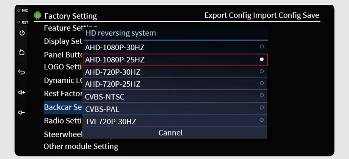 Go to Car settings >>Factorysettings>> Reverse (picture) settings>> Select AHD 1080P