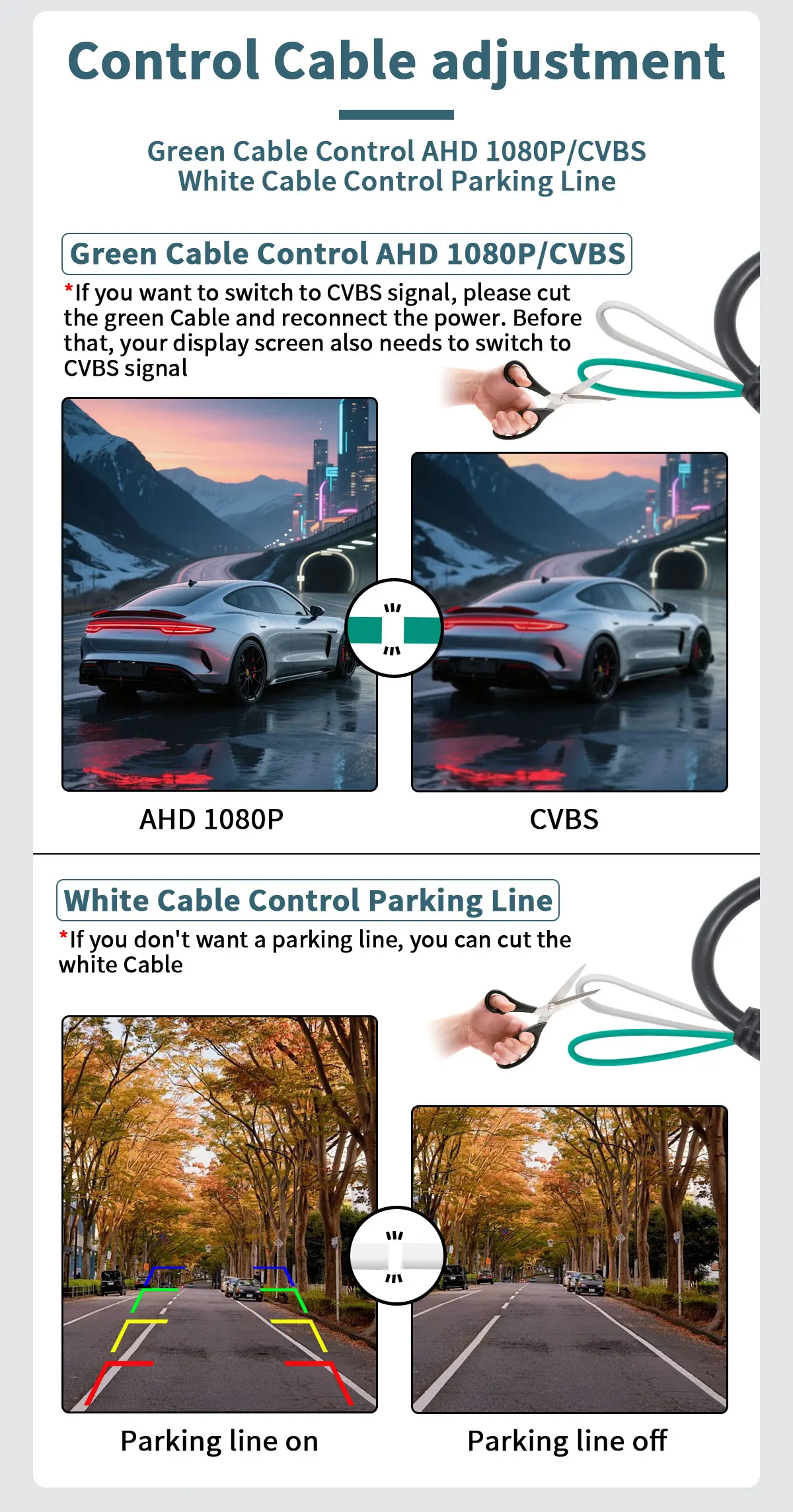 *If you want to switch to CVBS signal, please cut the green Cable and reconnect the power. Beforethat, your display screen also needs to switch to CVBS signal