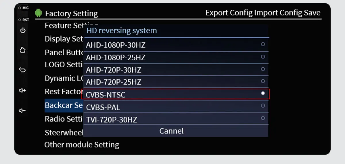 *If you want to use the CVBS signal, just follow the settings below, but before setting it up, you need to check if the camera is a CVBS signal Set the CVBS System,Go to Car Setting >> Factory Setting >> Reverse (Picture) Setting