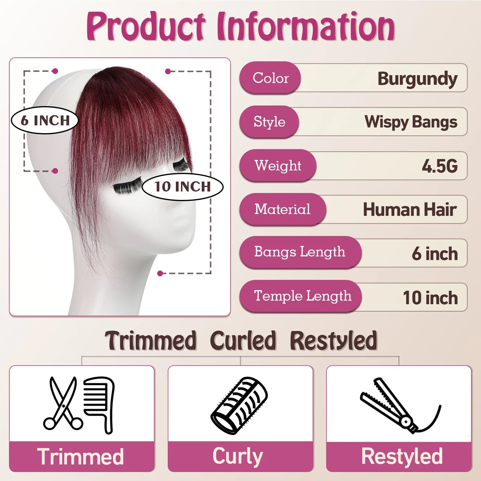With a stunning wine red hue, these bangs beautifully complement a variety of hair colors, giving you a fresh and trendy appearance. The clip-on design makes application a breeze, allowing you to transform your hairstyle in seconds without any fuss.