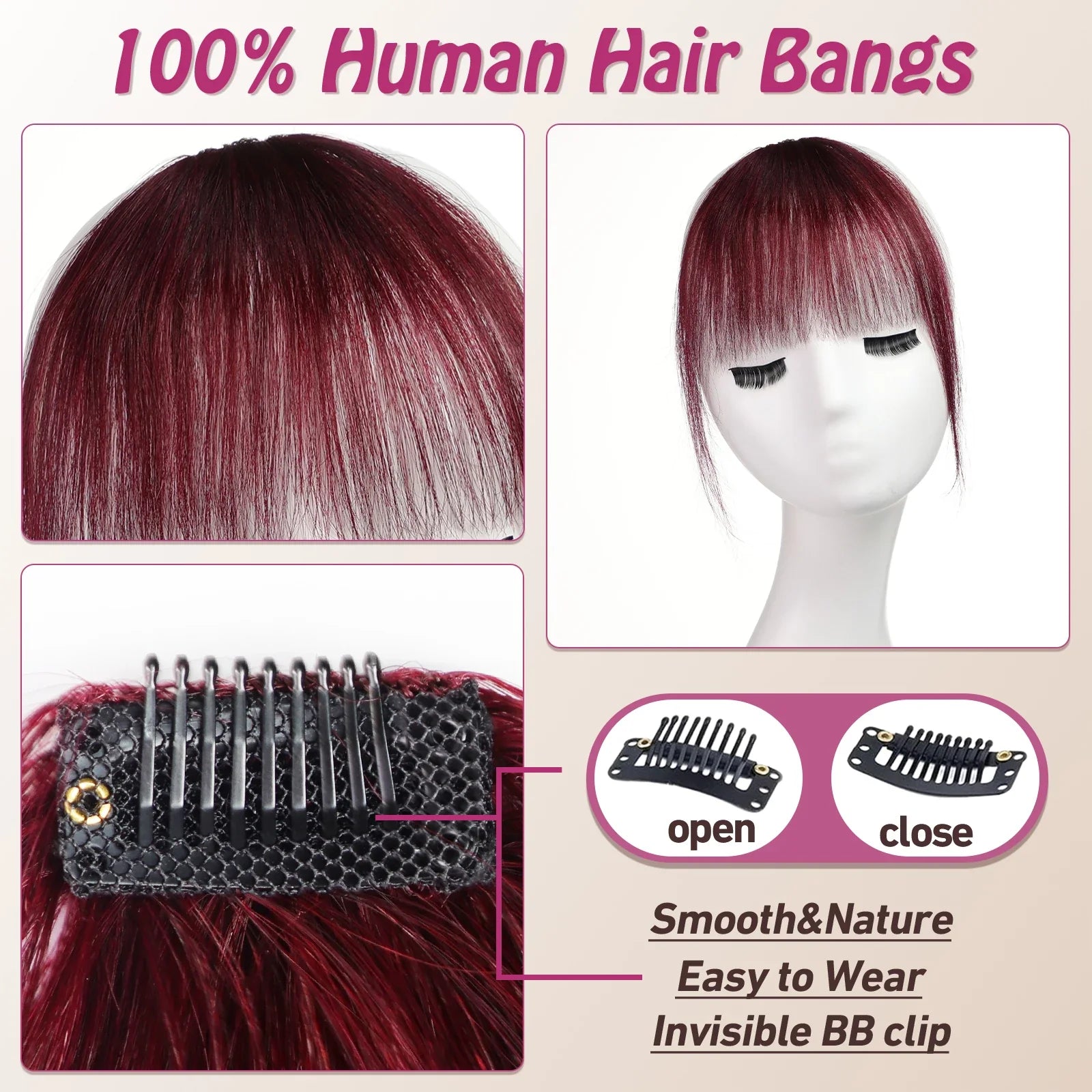Key features of our Burgundy Clip In Bangs include: