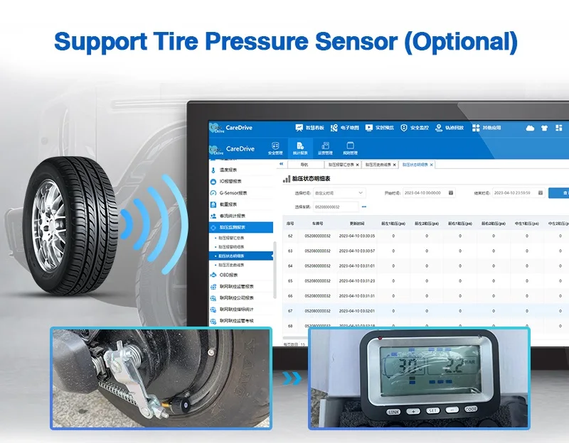 CareDrive MR910-360B's tire pressure sensor can measure the tire pressure value of the vehicle's tires in real time, and then MDVR uploads these tire pressure data to the platform. Customers can view the real-time tire pressure data changes and tire pressure data reports.