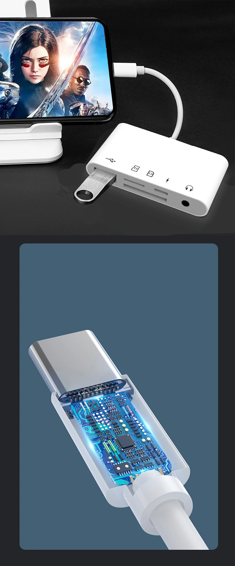 Using the Lightning/USB-C docking station, users can connect the phone to the corresponding interface to realize the functions of audio output, charging and data transmission at the same time. For example, users can connect headphones to the audio interface, and at the same time connect the charger through the USB-C interface for charging, and can also connect the USB flash drive through the USB-A interface for data transmission.