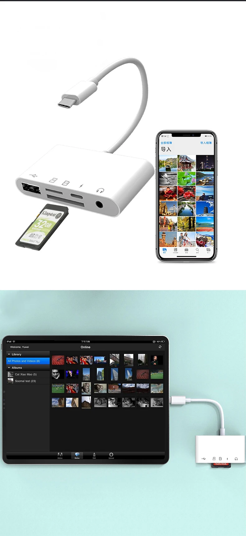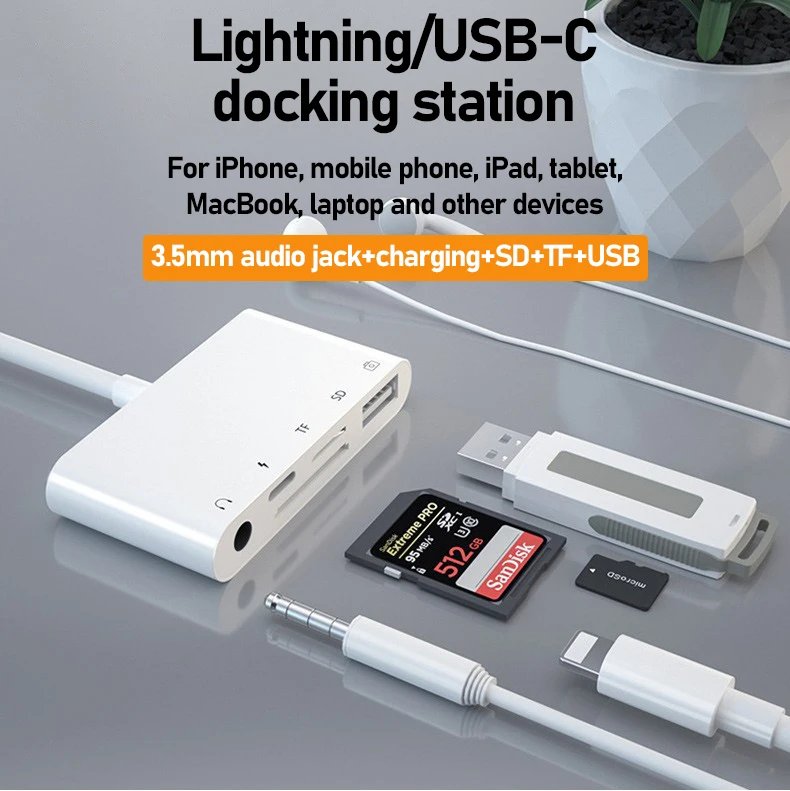 The Lightning/USB-C docking station is a versatile device that connects to devices such as iPhones, phones, iPads, tablets, MacBooks, and laptops. The docking station has multiple ports, including 3.5mm audio jack, charging interface, SD card slot, TF card slot and USB interface.