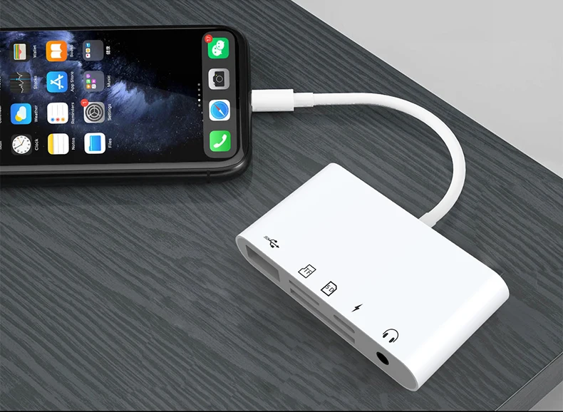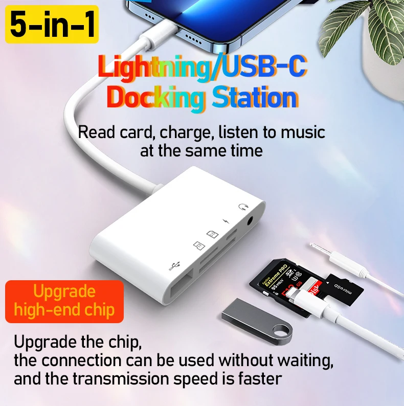 The 5-in-1 Lightning/USB-C docking station is a multifunctional device that can be used for card reading, charging and listening to music, etc. It is upgraded with a high-end chip, which can be used immediately after connection without waiting, and the transmission speed is faster.