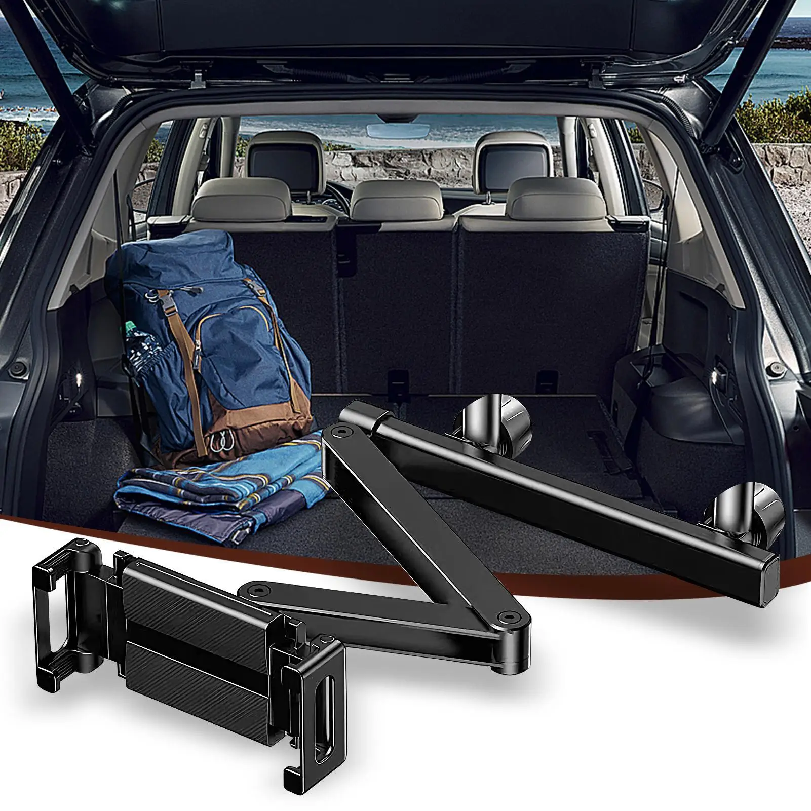 An adjustable Headrest Tablet Holder with 360-degree rotation, it provides seamless compatibility with most smartphones. Designed for travel enthusiasts, it combines the roles of a mobile stand, phone mount, and backseat organizer. Perfect for road trips, it suits kids, men, and women, offering convenience in autos, trucks, and RVs. Upgrade your travel experience with this practical accessory that prioritizes organization and entertainment without compromising usability.