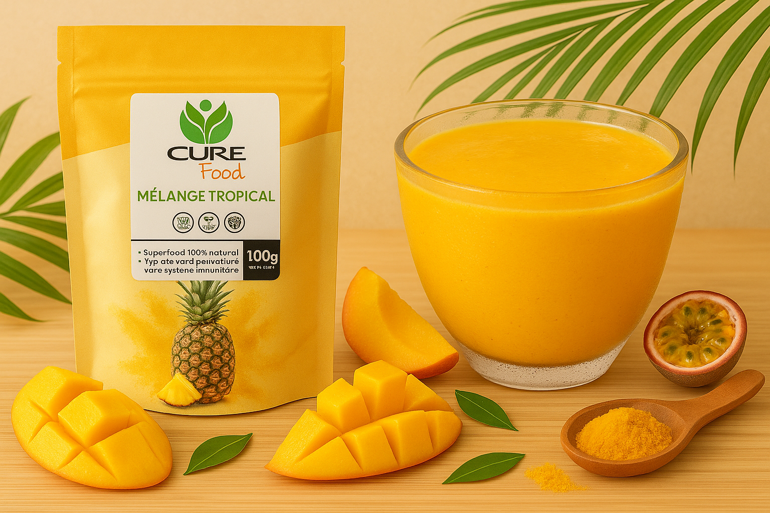 Discover an exotic escape with CureFood's Tropical Blend. A balanced fusion of tropical superfoods, including sweet mango powder, delicate papaya powder, aromatic passion fruit powder, smooth pineapple powder, and vibrant turmeric. A sensory experience that transports your taste buds to the tropics.
