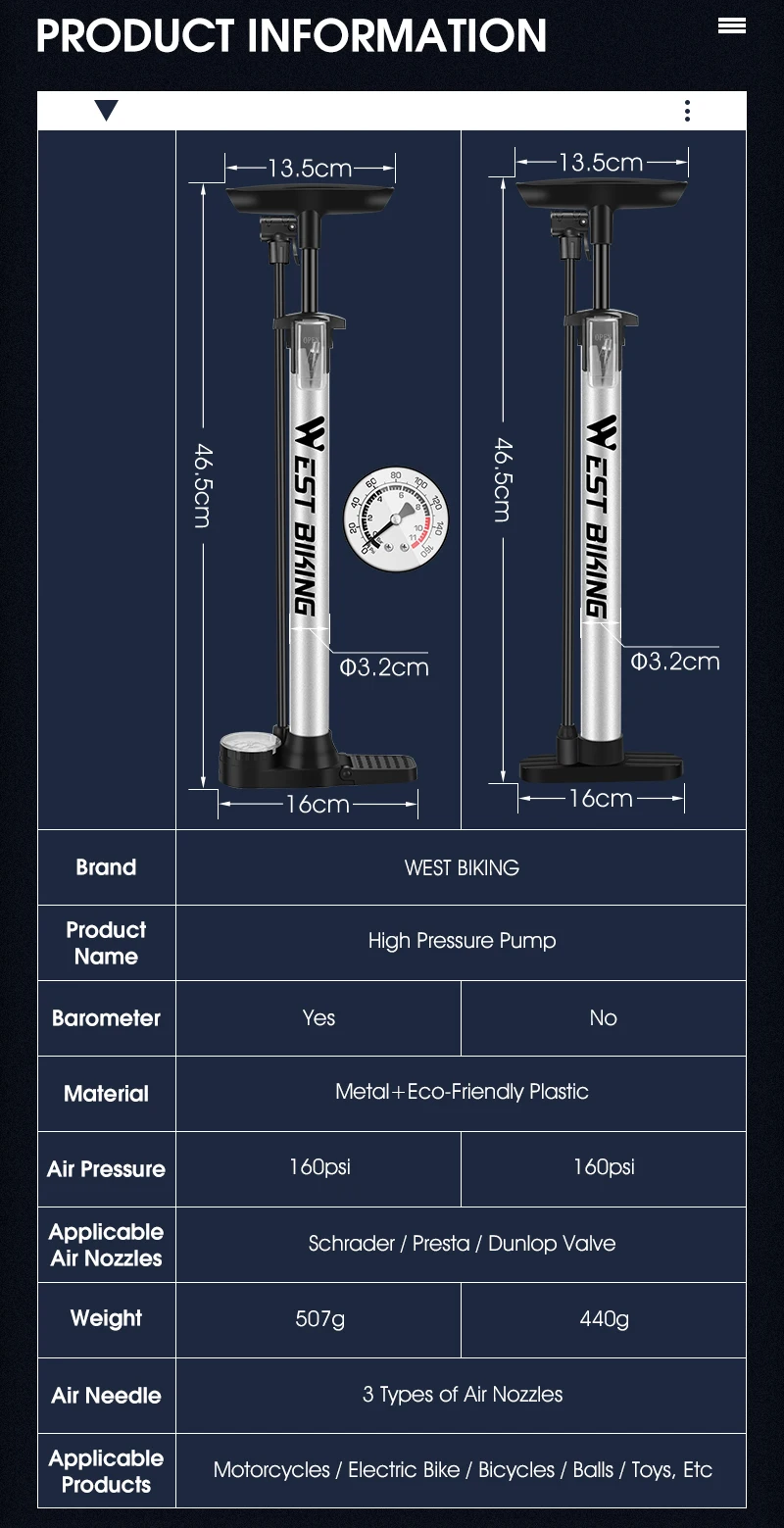The WEST BIKING 160PSI Bicycle Air Pump is designed to handle high-pressure needs, ensuring your MTB or road bike is optimally inflated for peak performance.