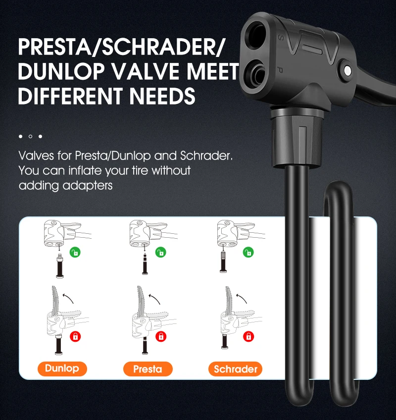 This hand pump is compatible with both Schrader and Presta valve types, making it a versatile tool for various bicycle models.